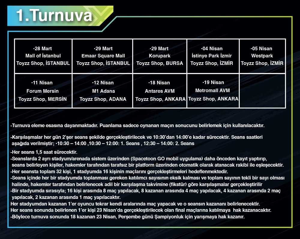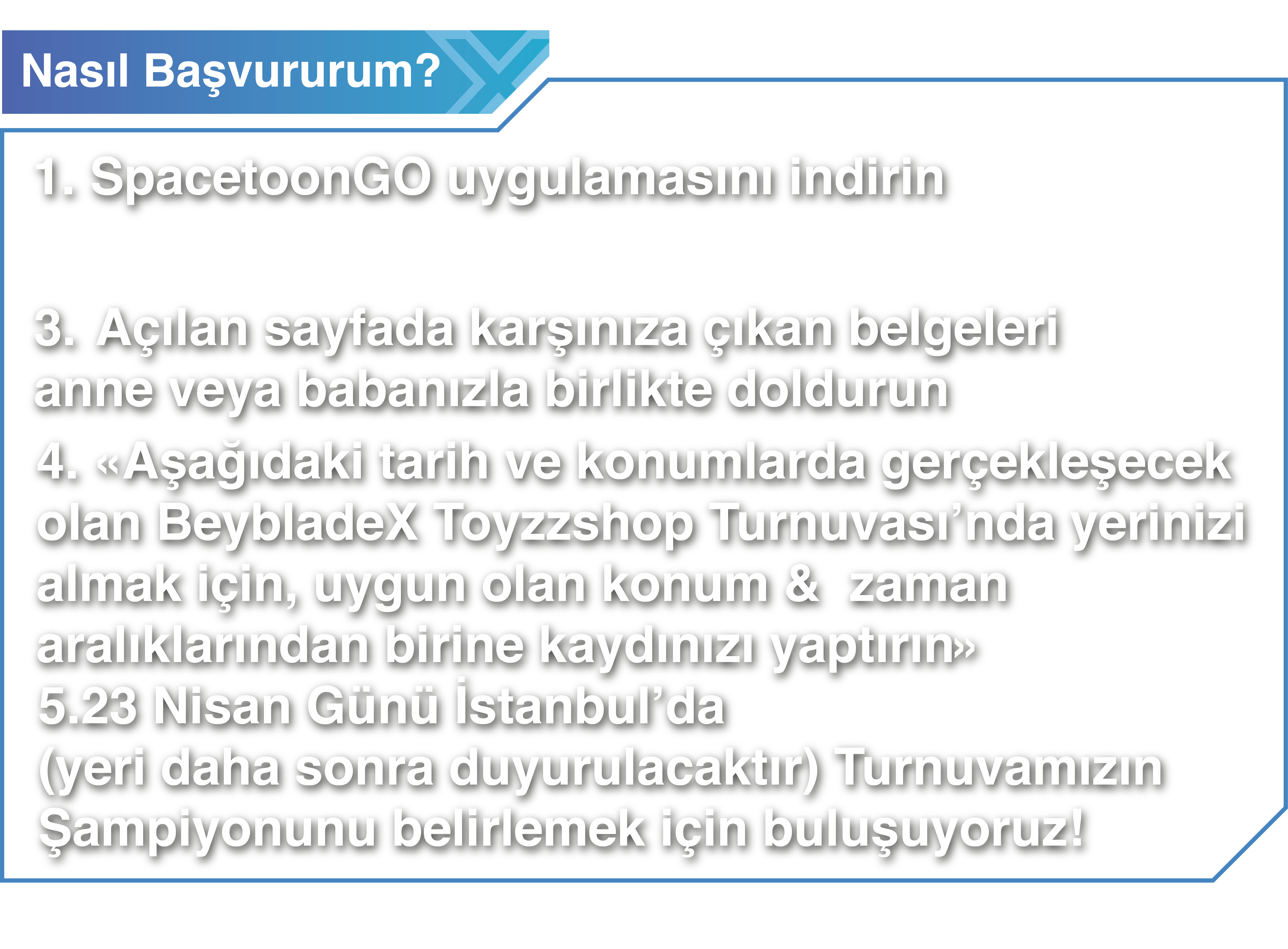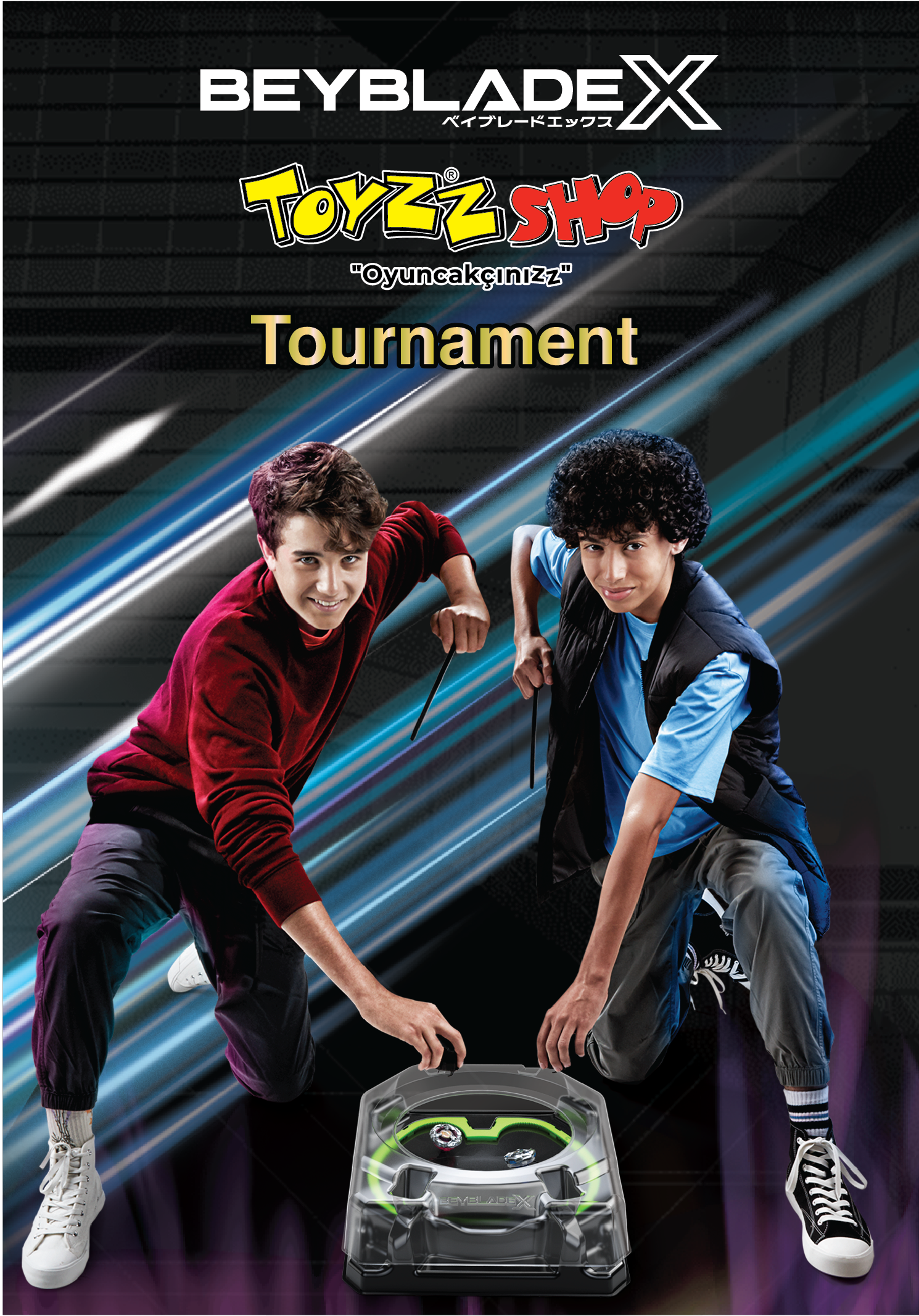 Oyun Kuralları: -Maçlar, Spacetoon GO üzerinden önkayıt yaptırıp, turnuva günü alanda ailesinden bir kişi (anne, baba veya velayet sahibi) ile birlikte gelip kaydını yaptıran kişiler arasında gerçekleştirilir. -Alanda kayıt yaptıran kişiler, Veli Muvafakatnamesi ve Mali Hakların Devri & Manevi Hakları Kullanımına İlişkin Muvafakatname’yi anne, baba veya velayet sahibiyle birlikte imzalamalıdır. -1 Maç, 3 rounddan oluşur. -3 round içinde kazananı belirlemek için puan durumuna bakılır. -Toplam 4 puana ulaşan kişi o maçı kazanmış olur. -Puanlama; * Xtreme Finish: 3 Puan (Rakibinin blade’ini Xteme Finish alanına düşmesini sağlamak) * Knockout Finish: 2 Puan (Rakibinin blade’ini sağ ve solda bulunan Knockout Finish alanlarından birine düşmesini sağlamak) * Burst Finish: 2 Puan (Rakibinin blade’inin parçalarına ayrılmasını sağlamak) * Survivor Finish: 1 Puan (Rakibinin blade’ini durdurup, kendisinin hala dönmeye devam etmesi)