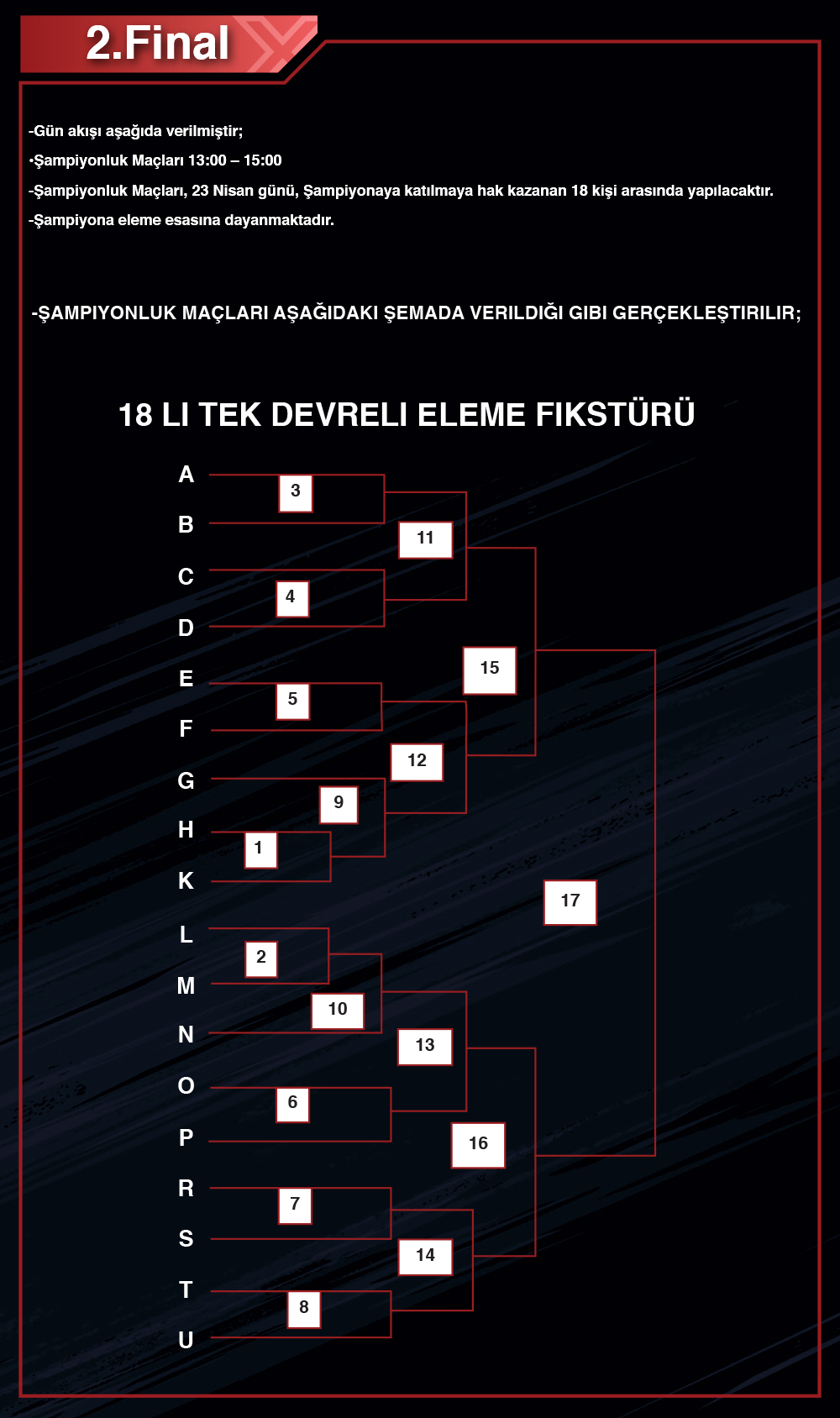 - Turnuva alanında koşmak, itişmek ve sert davranışlarda bulunmak yasaktır. - Güvenliği tehdit eden ya da sportmenlik dışı davranışlar sergileyen katılımcılar turnuvadan diskalifiye edilebilir. - Ebeveyn veya velayet sahibi etkinlik süresince katılımcının yanında bulunmalıdır.